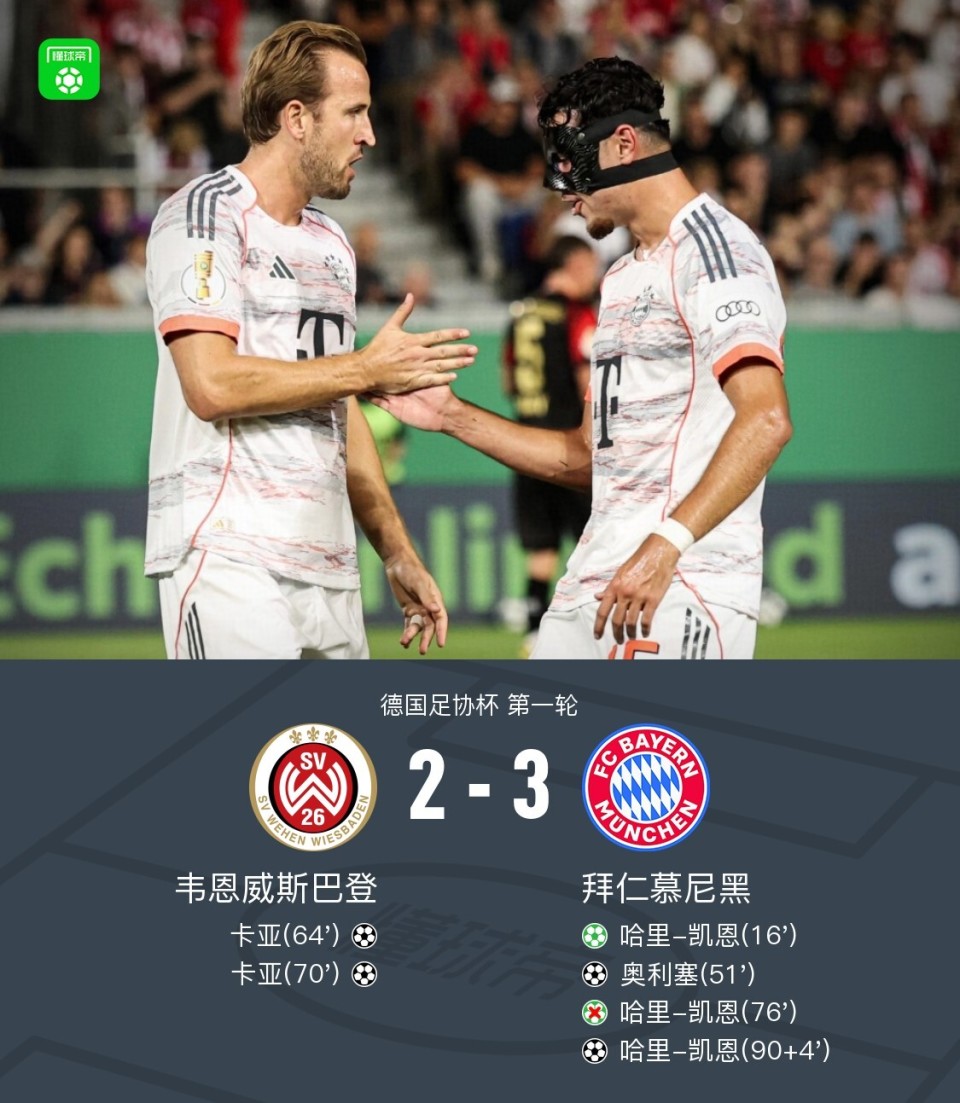 北京时间8月28日德国足协杯 第一轮,韦恩威斯巴登对阵拜仁慕尼黑。韦恩威斯巴登卡亚梅开二度。拜仁慕尼黑哈里-凯恩梅开二度,奥利塞破门。最终比分韦恩威斯巴登 2-3 拜仁。